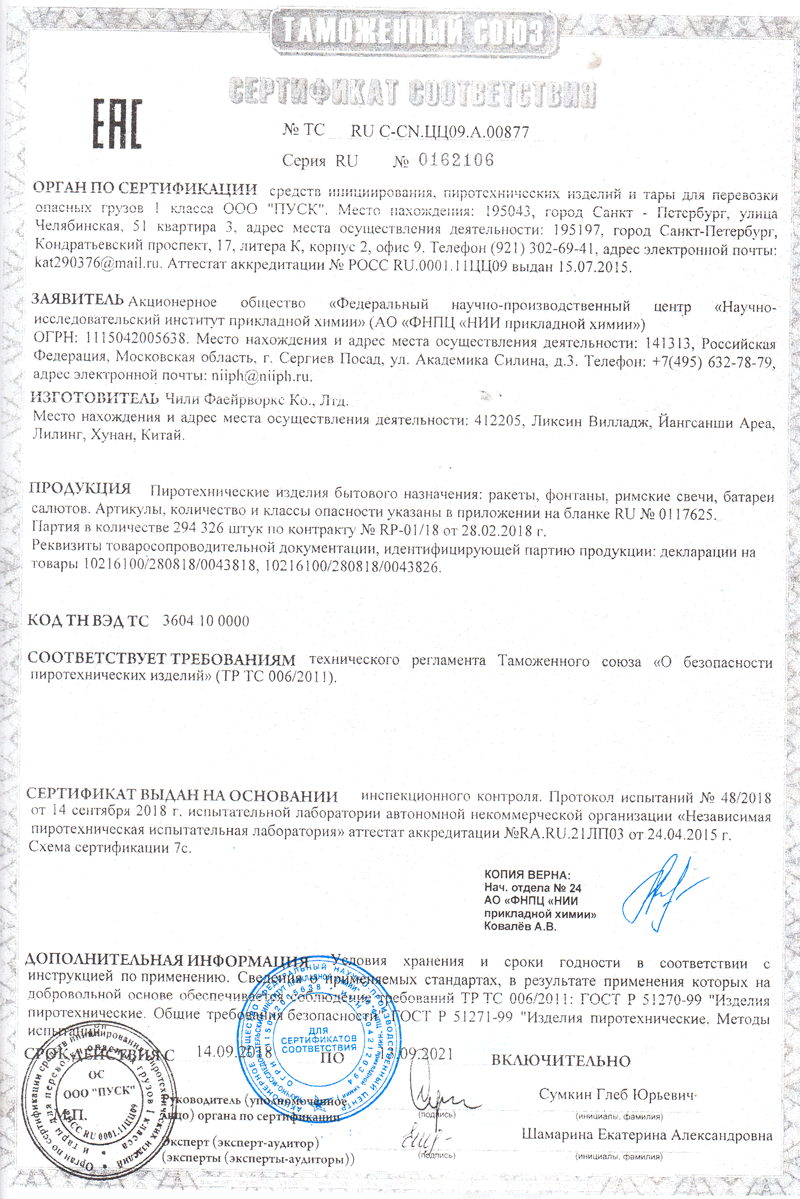 Сертификат соответствия № 0162106  - Михайловск Свердловская область | mihajlovsksverdlovskaya.salutsklad.ru